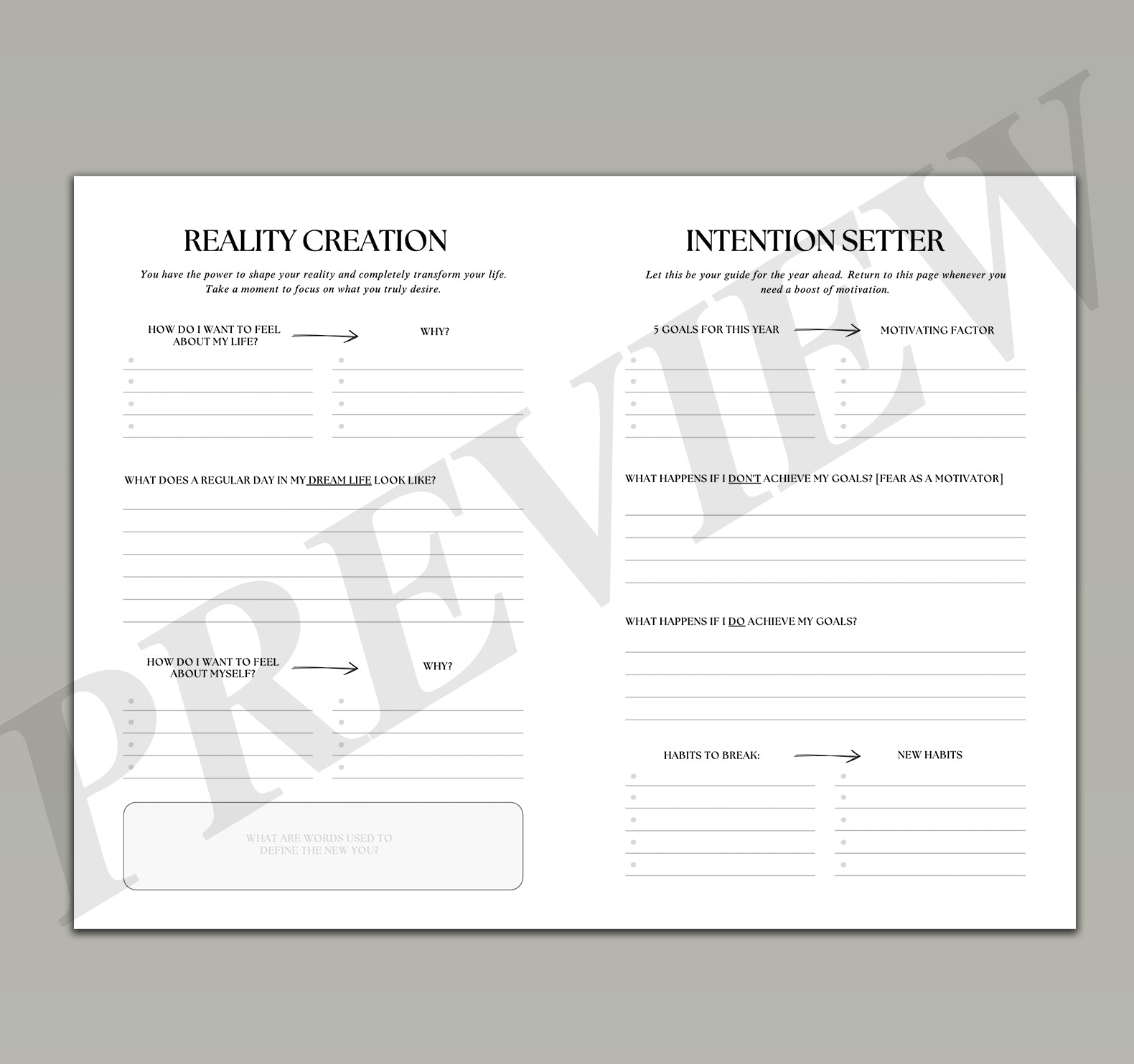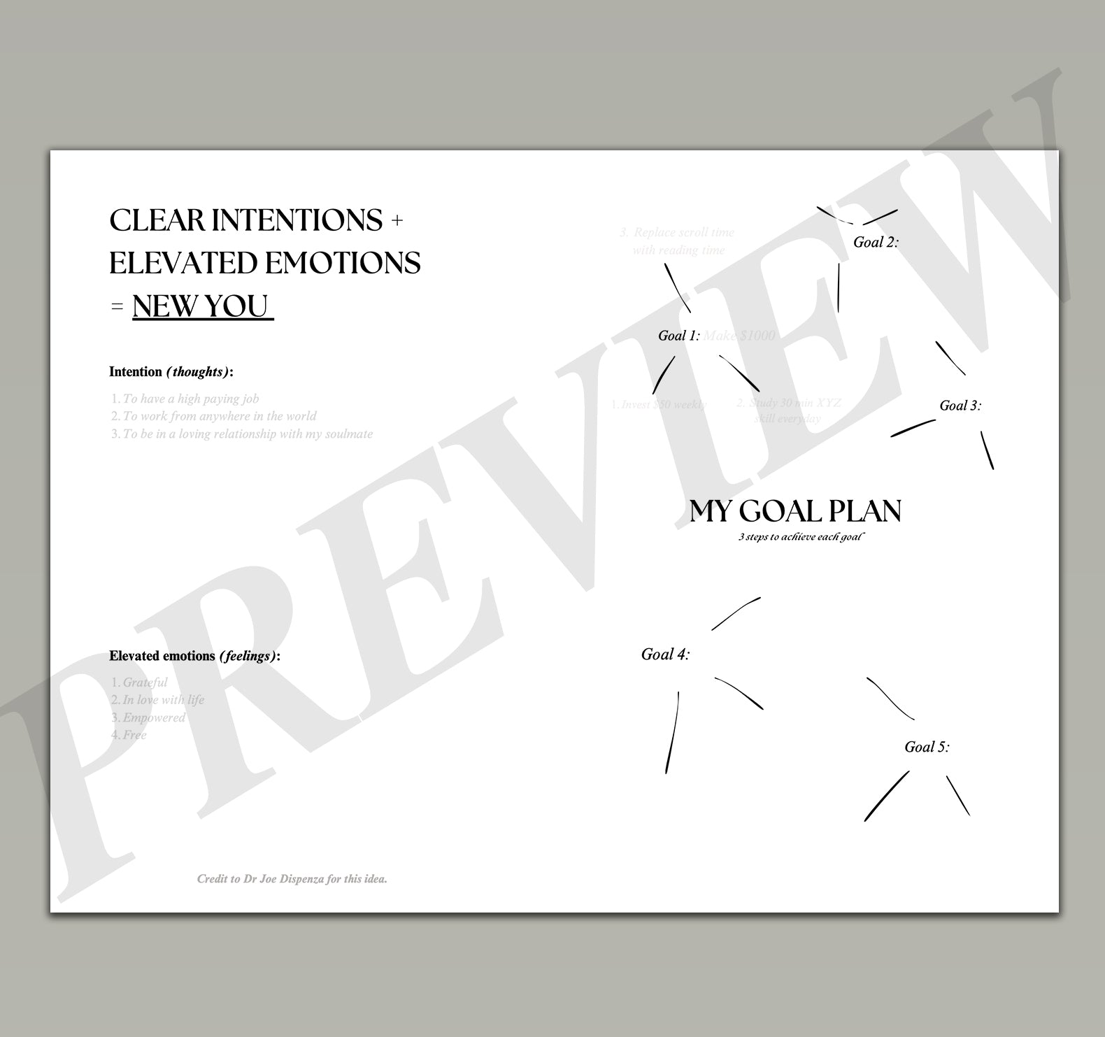Includes vision boards, affirmations, belief blueprint, goal planner and Dr. Joe Dispenza-inspired prompts. -