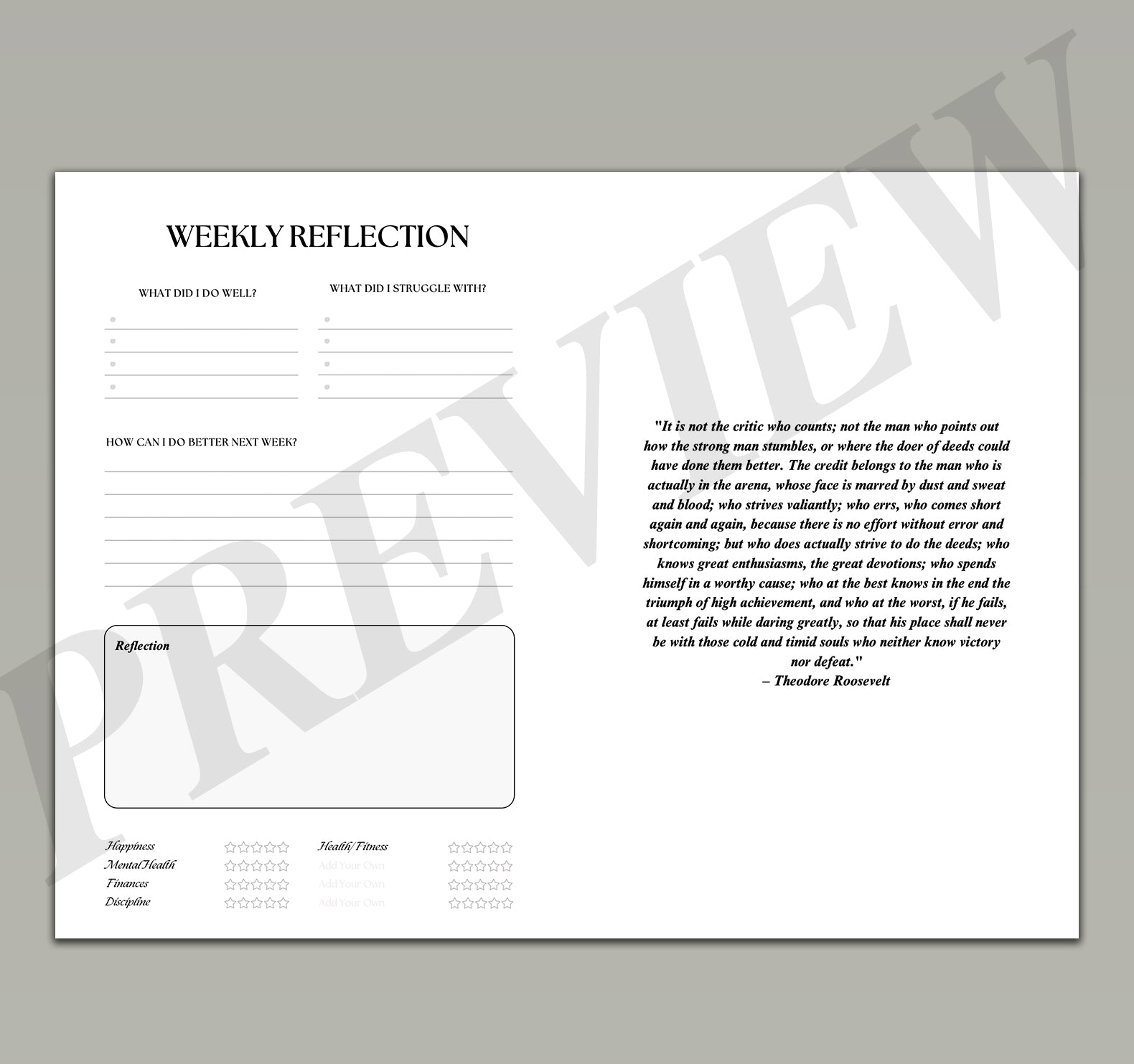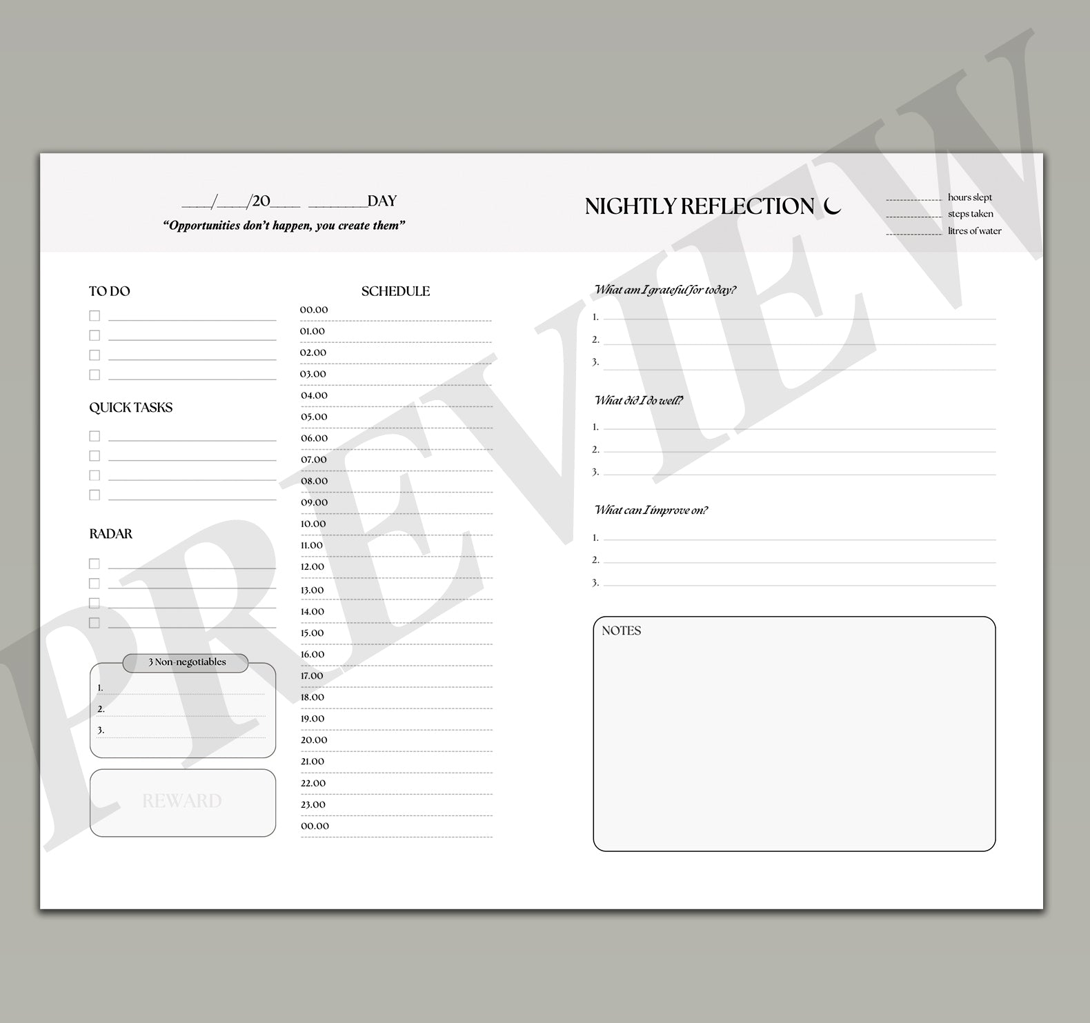 - Reflection Prompts: Daily, weekly, and monthly exercises to help you refine your progress and align with your goals
